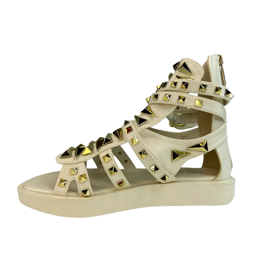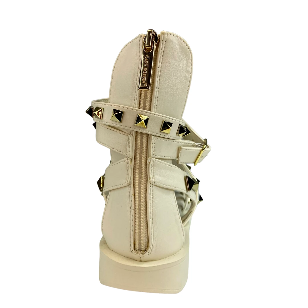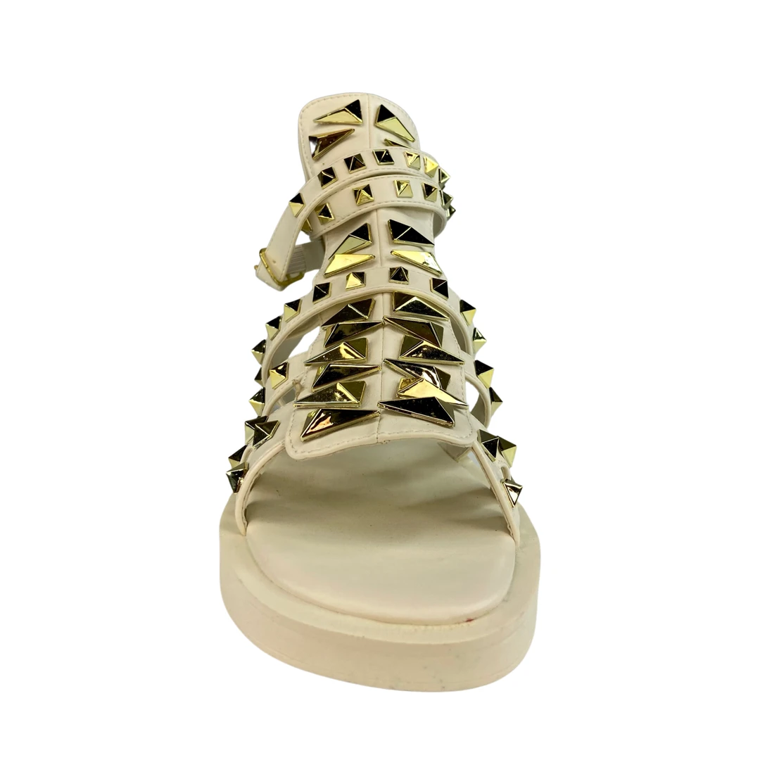 Open toe high-sandal, studs, rubber outsole, PU leather, and memory foam insole.