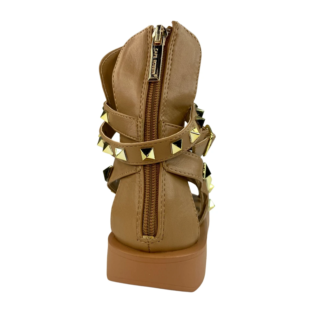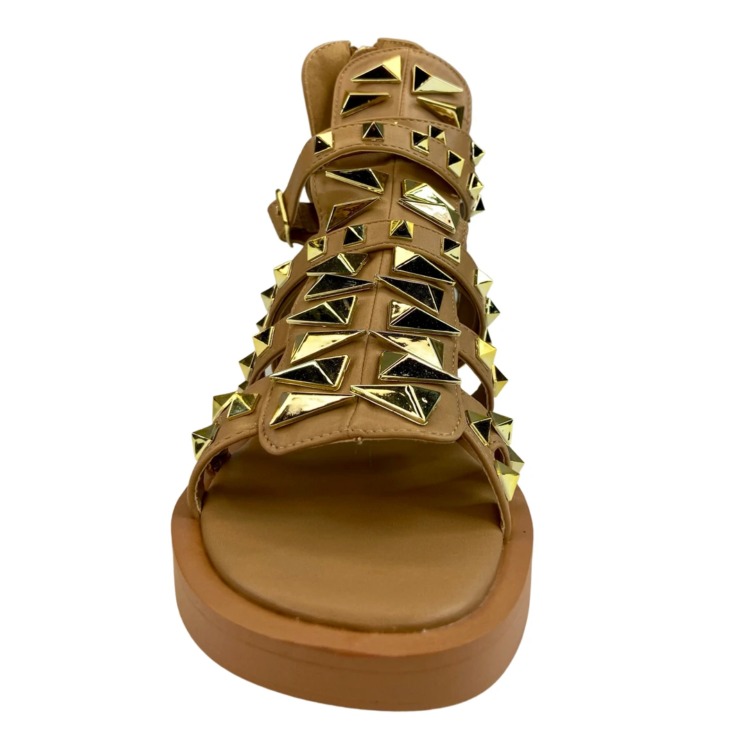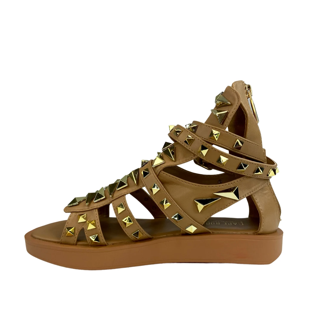 Open toe high-sandal, studs, rubber outsole, PU leather, and memory foam insole.