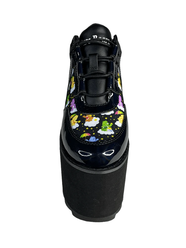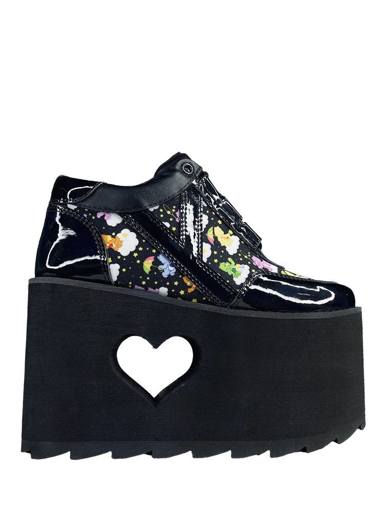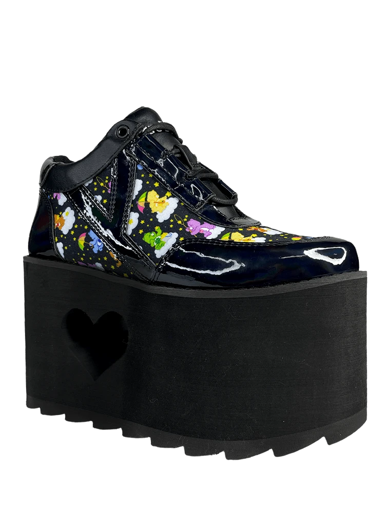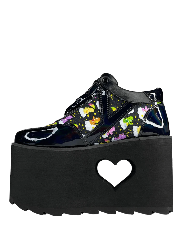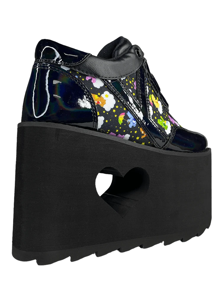 Black hologram details. Black EVA bottom with heart cutouts. Black rubber outsole. 3-inch platform, 4-inch heel. US women’s sizing. Man-made materials.
