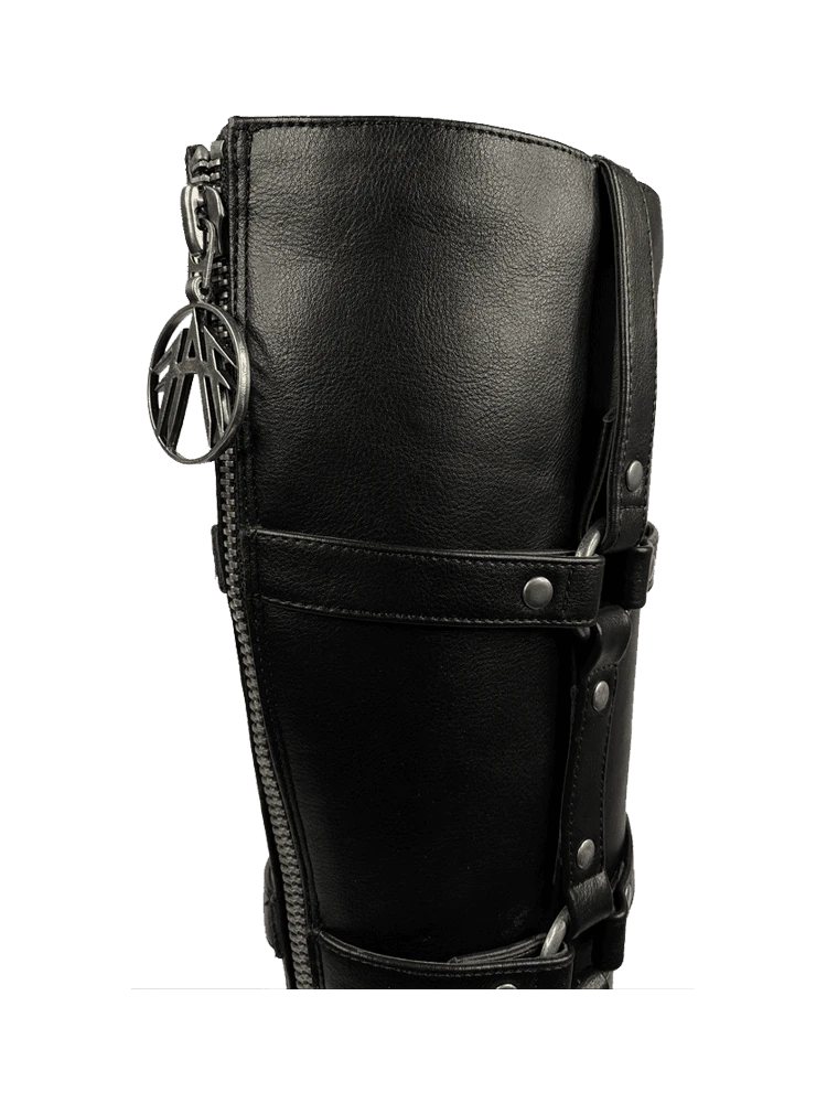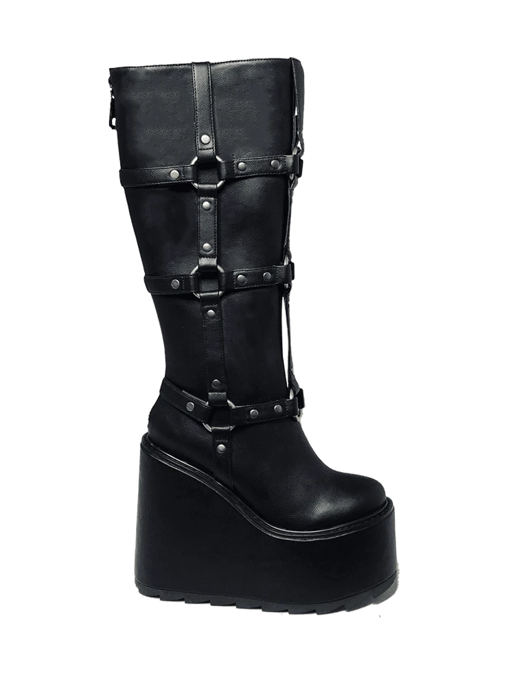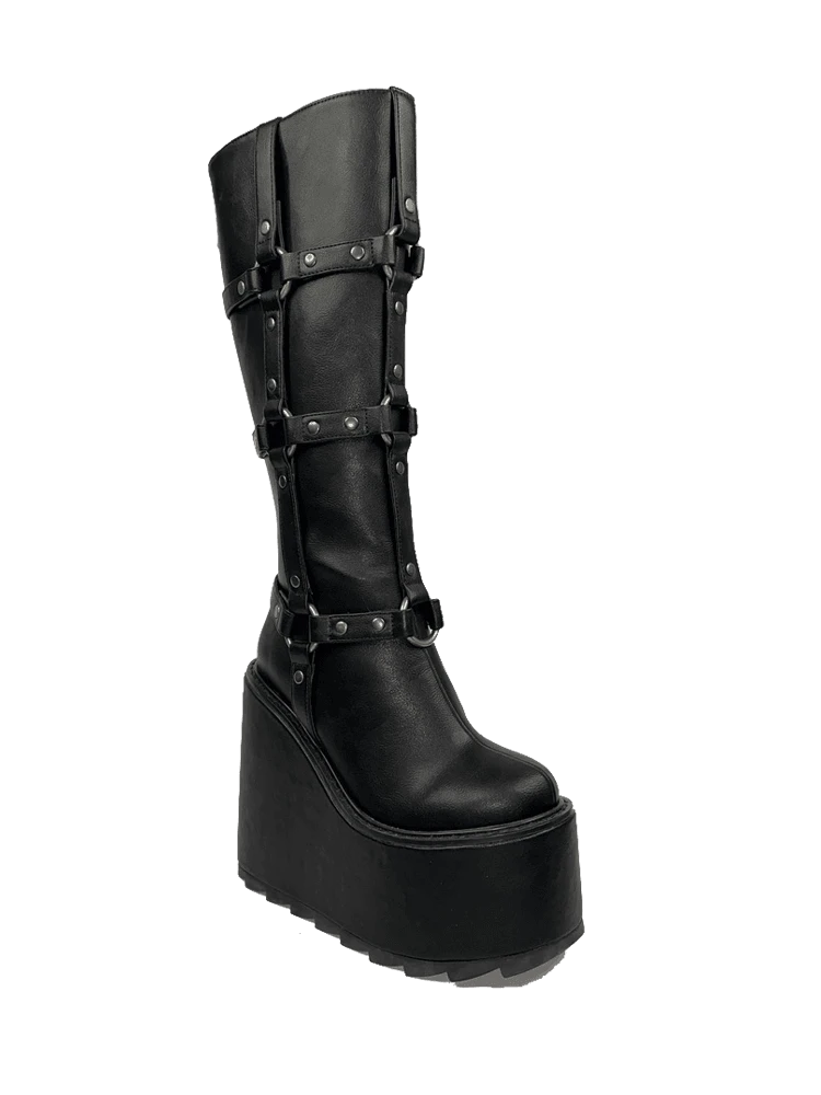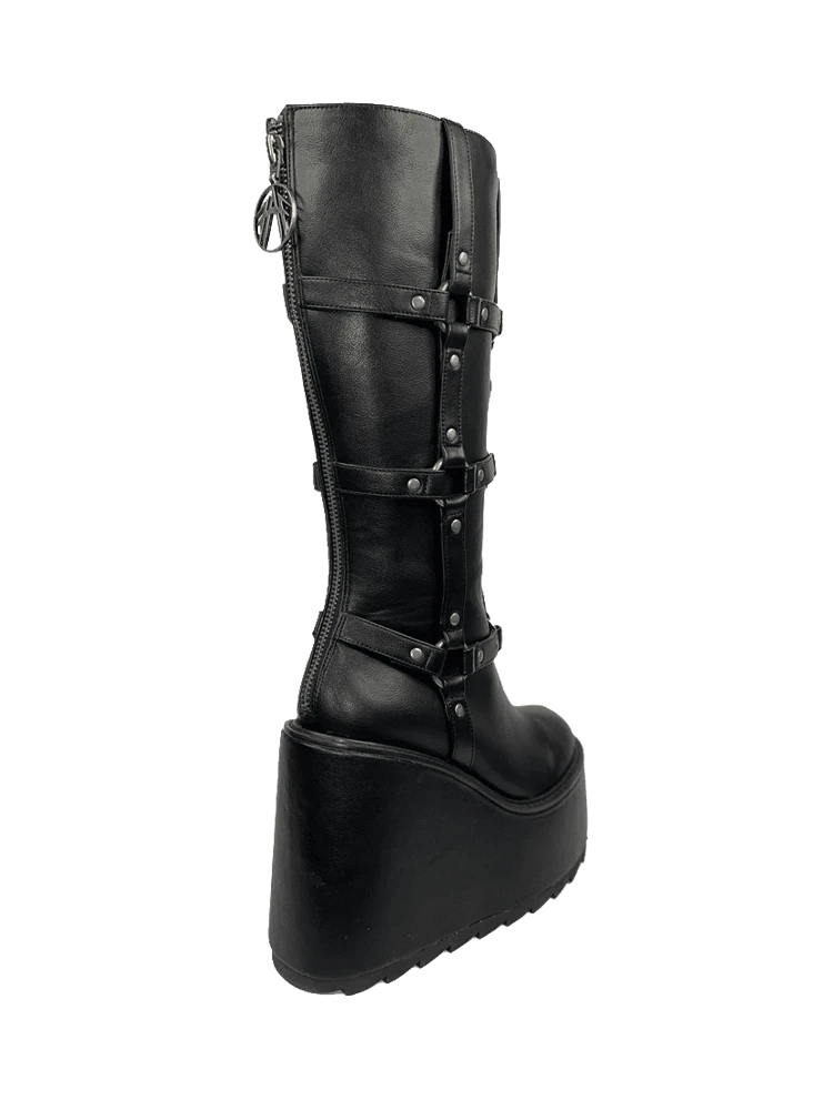 - Triple O-Ring Strapped Knee High Boot w/ Jagged Tread + Logo Zipper Pull.Â