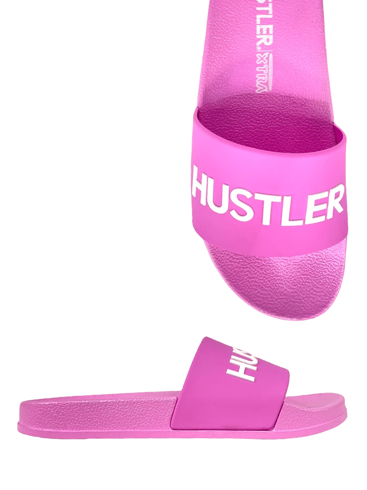 Pink rubber slide upper with white molded Hustler logo. Pink rubber bottom and outsole.