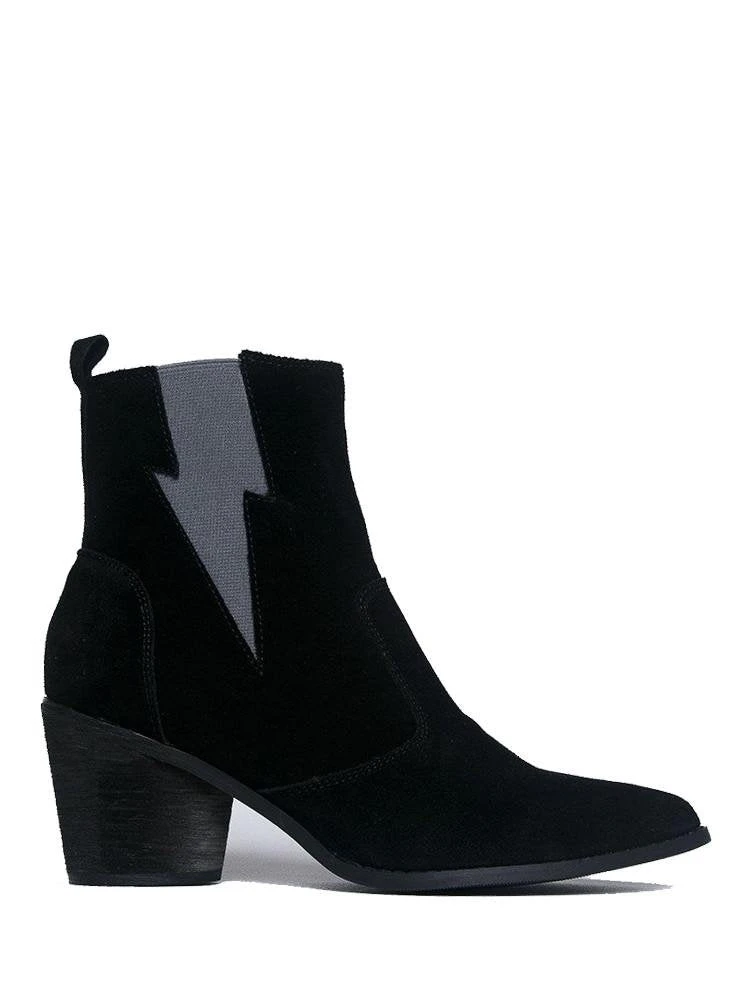 Shock them in our electrifying Bolt booties! The classic black Chelsea boot gets a facelift with our signature lightning bolt gore and a luxe suede upper.