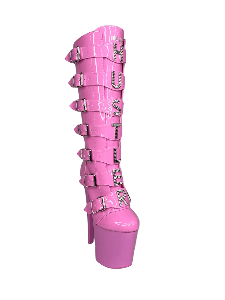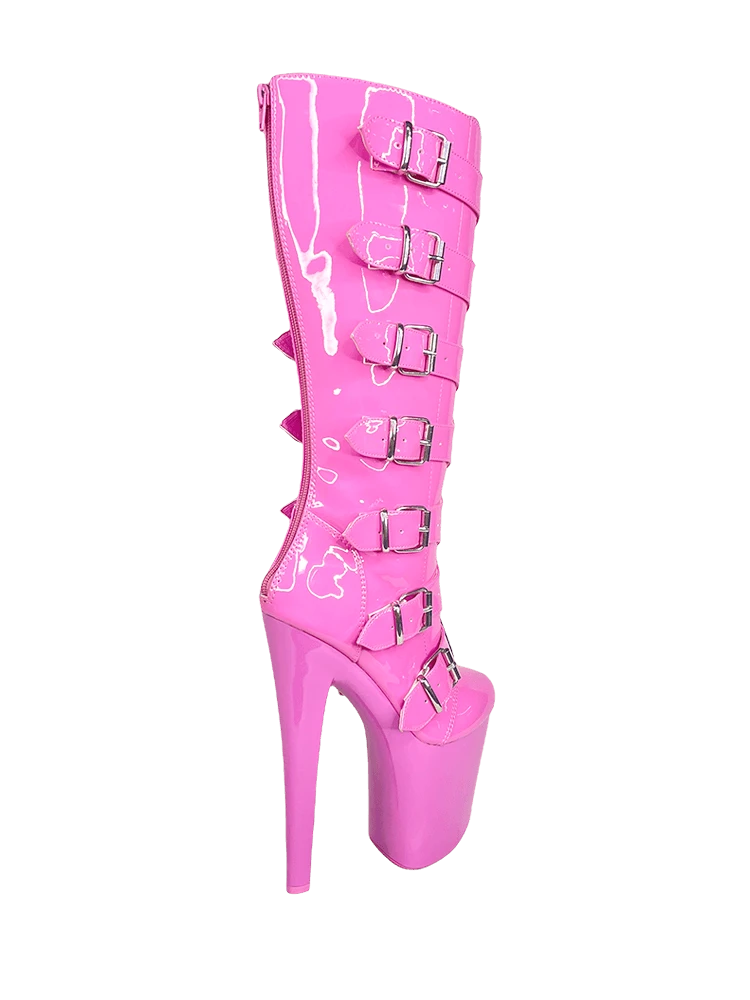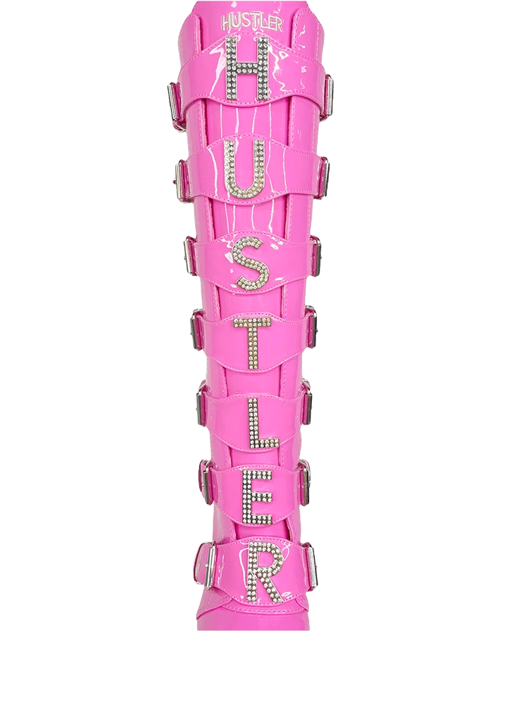 7.5-inch heel. Silver chrome buckles and hardware. Silver chrome lettering with white rhinestones. Fuchsia rubber outsole.Â
