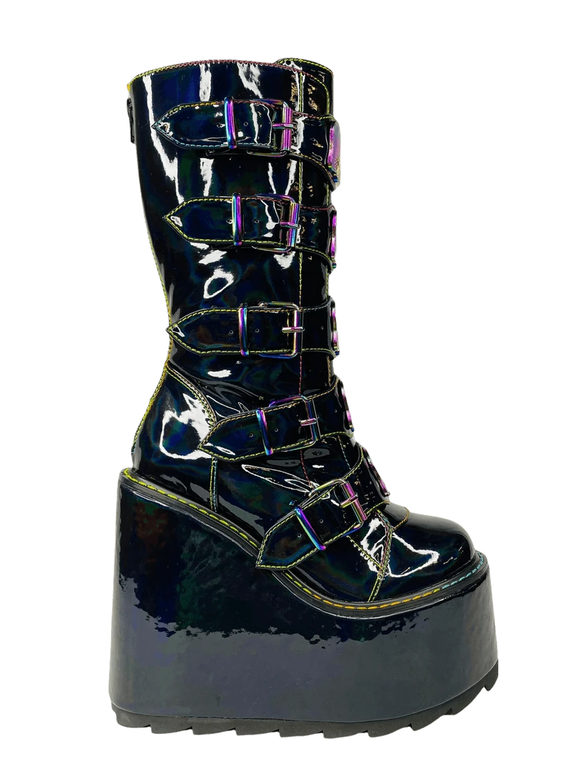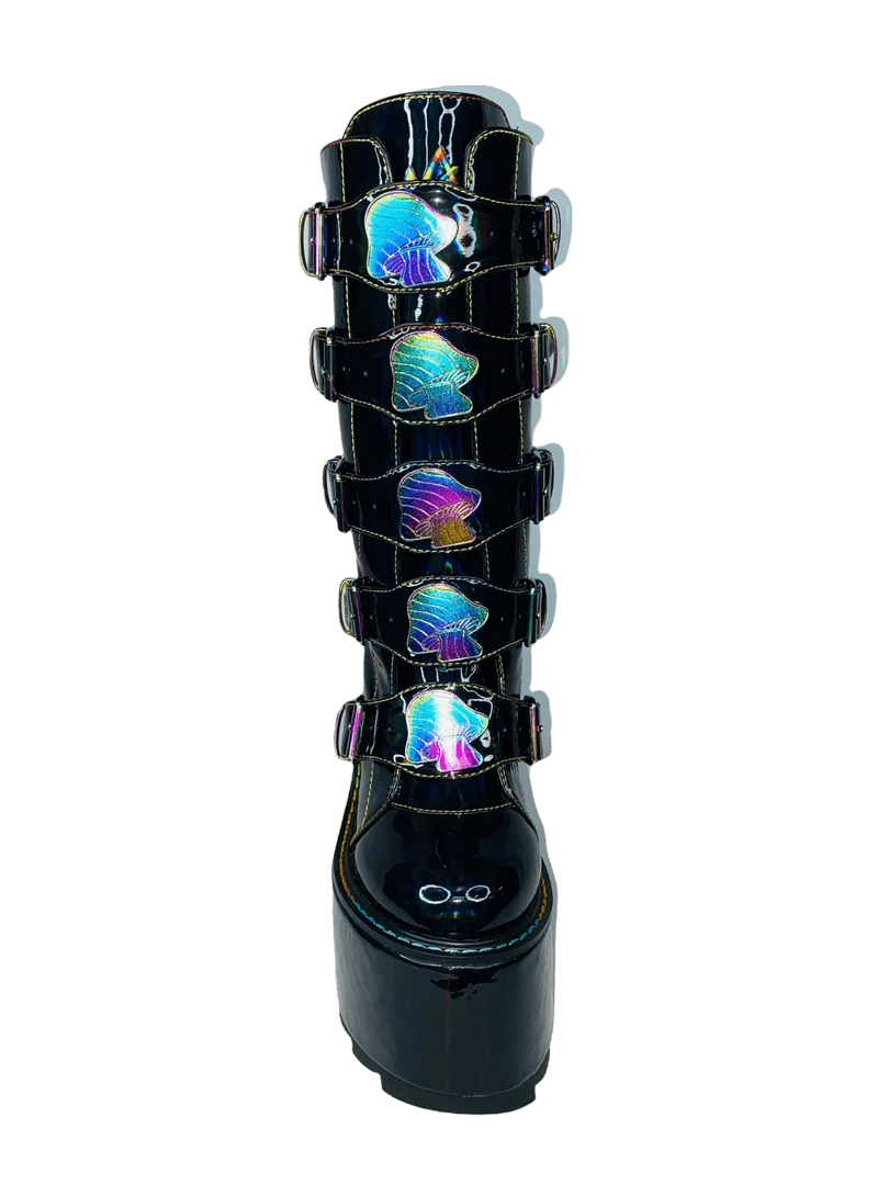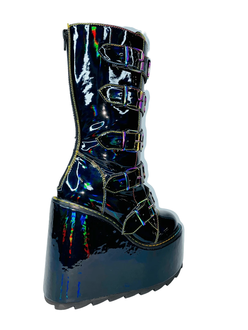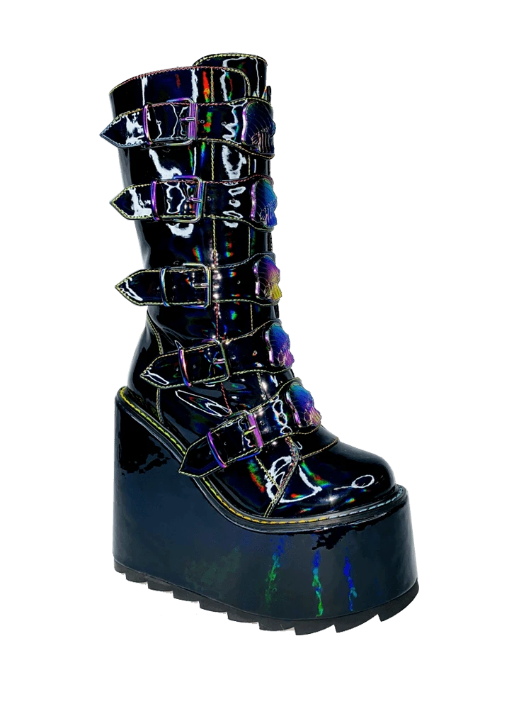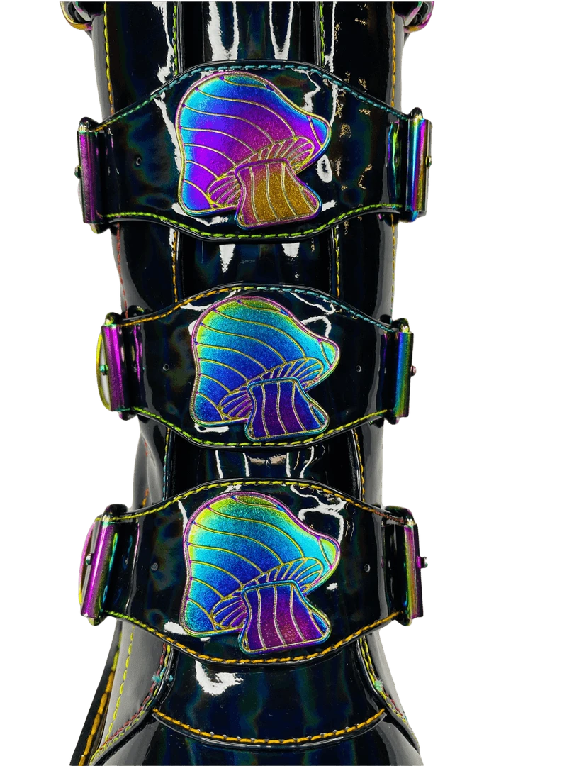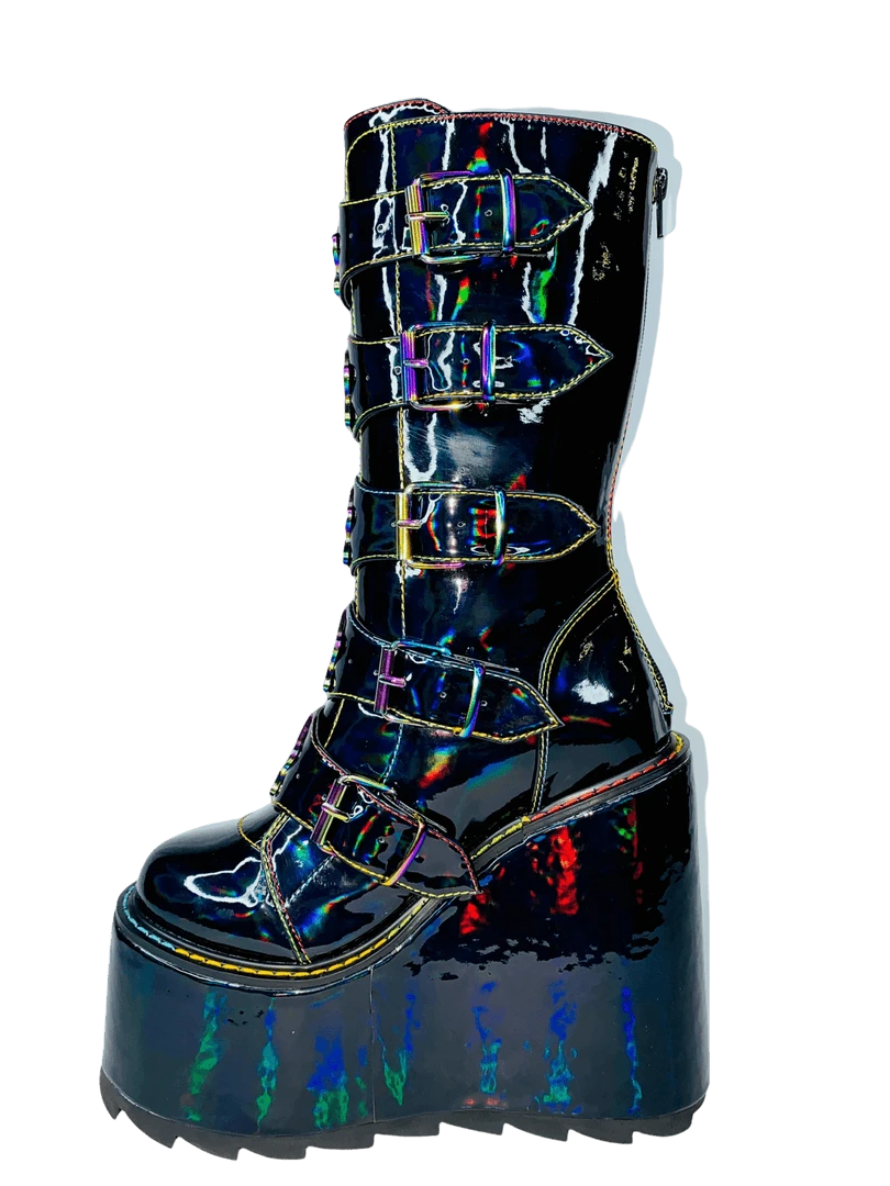 Black Hologram Upper. Oxidized Rainbow Metal Buckles and Hardware. Oxidized Rainbow Metal Mushroom Charms. Black Hologram Wrapped Eva Bottom. 6-inch heel. 2 3/4-inch front platform. 5 Double Straps. US women’s sizing. Man-made materials.