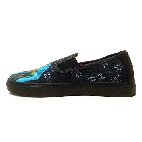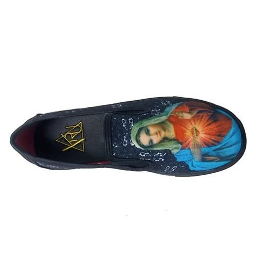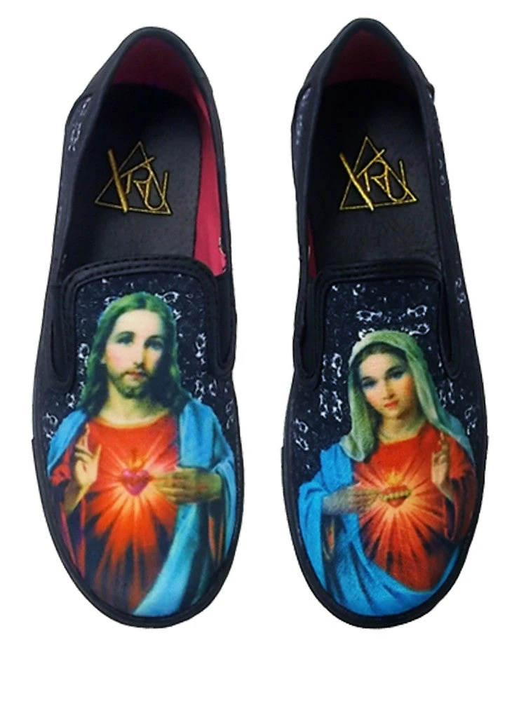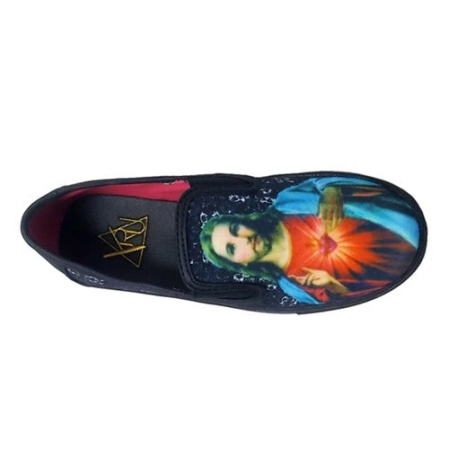 Slip On Sneaker. Vegan Leather Binding. Vegan Leather Back Overlay. Canvas Upper. Rubber Outsole. Right Shoe Jesus Image, Left Shoe Mary Image. Runs 1/2 Size Big For Women And Runs 1 Whole Size Big For Men. Please Note That This Is A Loose Fitting Shoe.