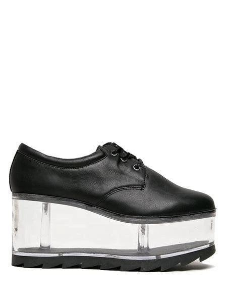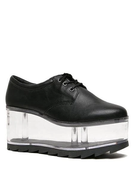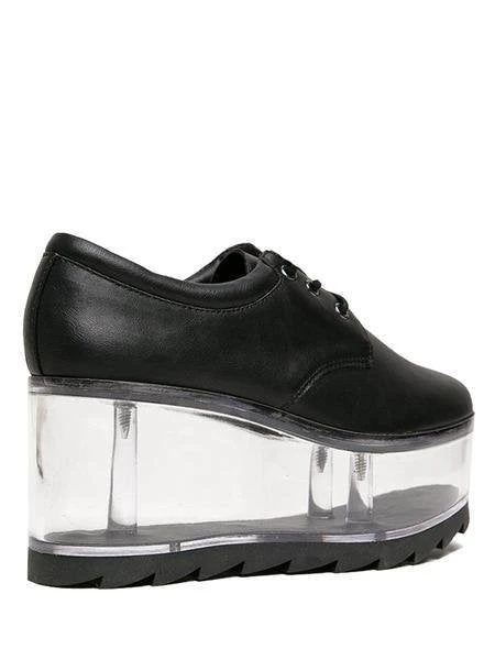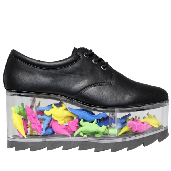Black vegan leather upper. Clear plastic bottom. Velcro foot bed opening with “portal” to insert toys, candy, fun stuff in clear bottom. 3 1/4″ heel and 2 1/4″ platform